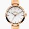 Elegantni ženski časovnik u boji zlata, sa belim ciferom i diskretnom dekoracijom na njemu. Sat poseduje tanku i elegantnu narukvicu.