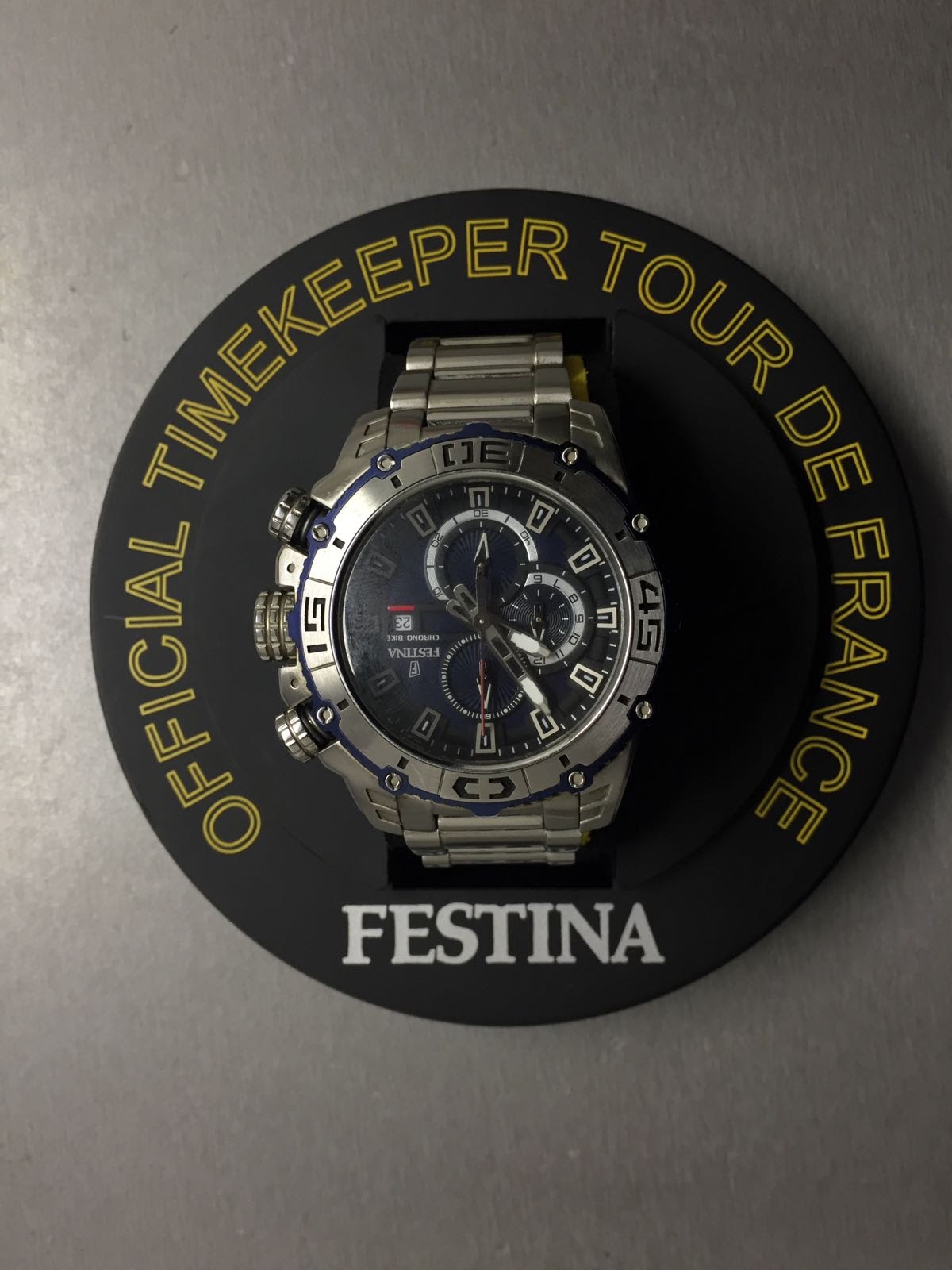 Sat stavljen na ruku jednom. Proizvođač/BrendFestina Model Chrono Bike/ Referentni broj F16599 MehanizamKvarcni Model mehanizma Materijal kućištaČelik Prečnik kućišta48.5 mm Tip narukvice Čelik Vodootpornost 100.0 m Tip stakla Mineralno Prikaz vremena Analogni