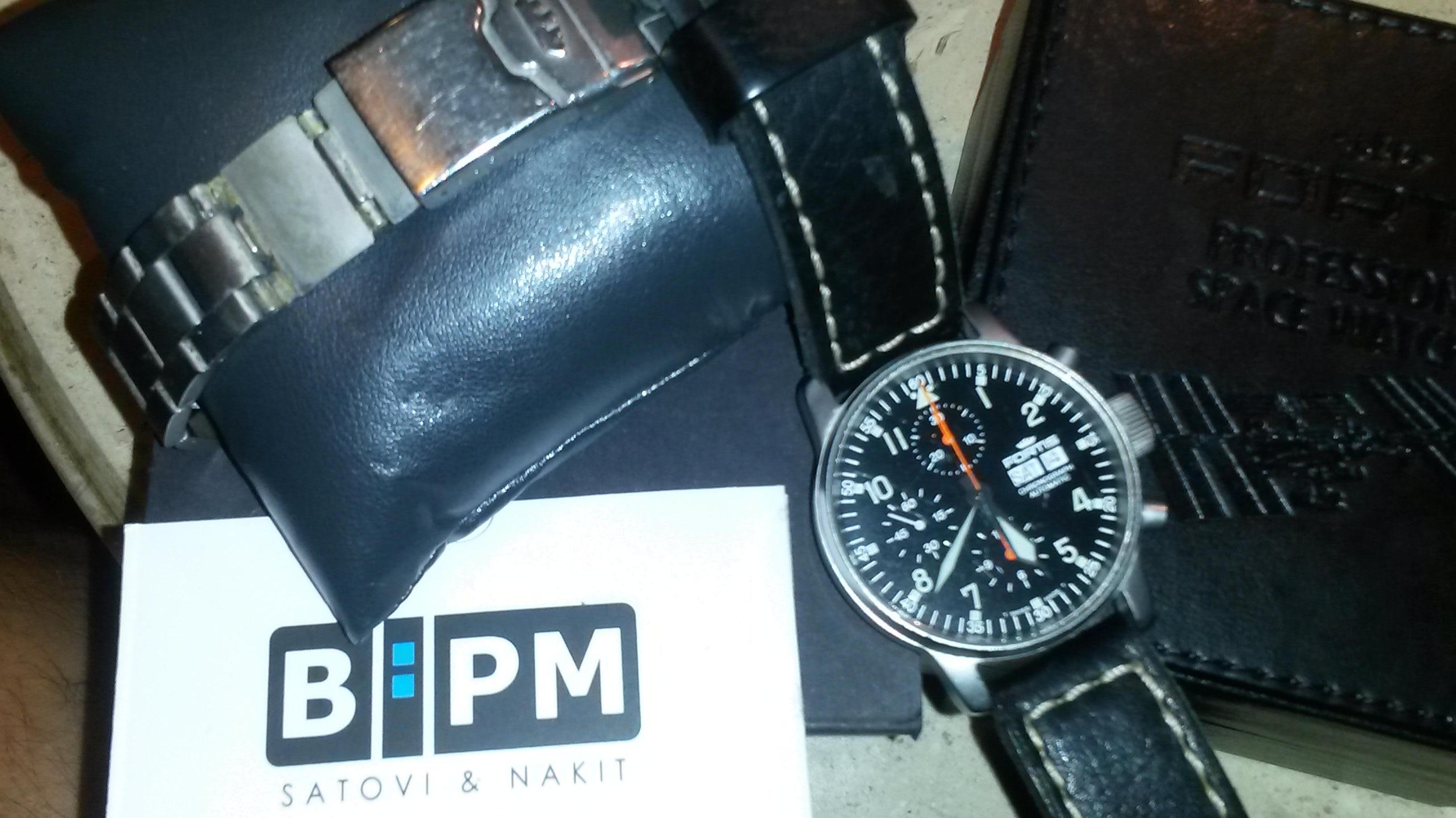 Fortis Flieger Chronograph Automatic Men's Watch. Two times awarded Fortis automatic Flieger Chronograph watch represents longevity, sustainability and economic compatibility in super-quality Swiss pack. Solid built stainless steel case and ‘screwed in’ crown guarantees 100 meter of water-resistants. Watch comes with the stainless steel bracelet with flip-lock clasp and with the leather strap. The automatic ETA Valjoux Caliber 7750 movement contains 25 jewels, that vibrate at 28,800 times per hour, and Incablock shock absorber. For its classic design and lasting appeal, Fortis Flieger Chronograph was also awarded with the „Busse Longlife Designe Award“, as the 2009 watch of the year, which approves its suitability for both – civilian and army use. Case Diameter 40 mm. Since 1994 Fortis has been the exclusive supplier of manned space missions authorized by the Russian Federal Space Agency.