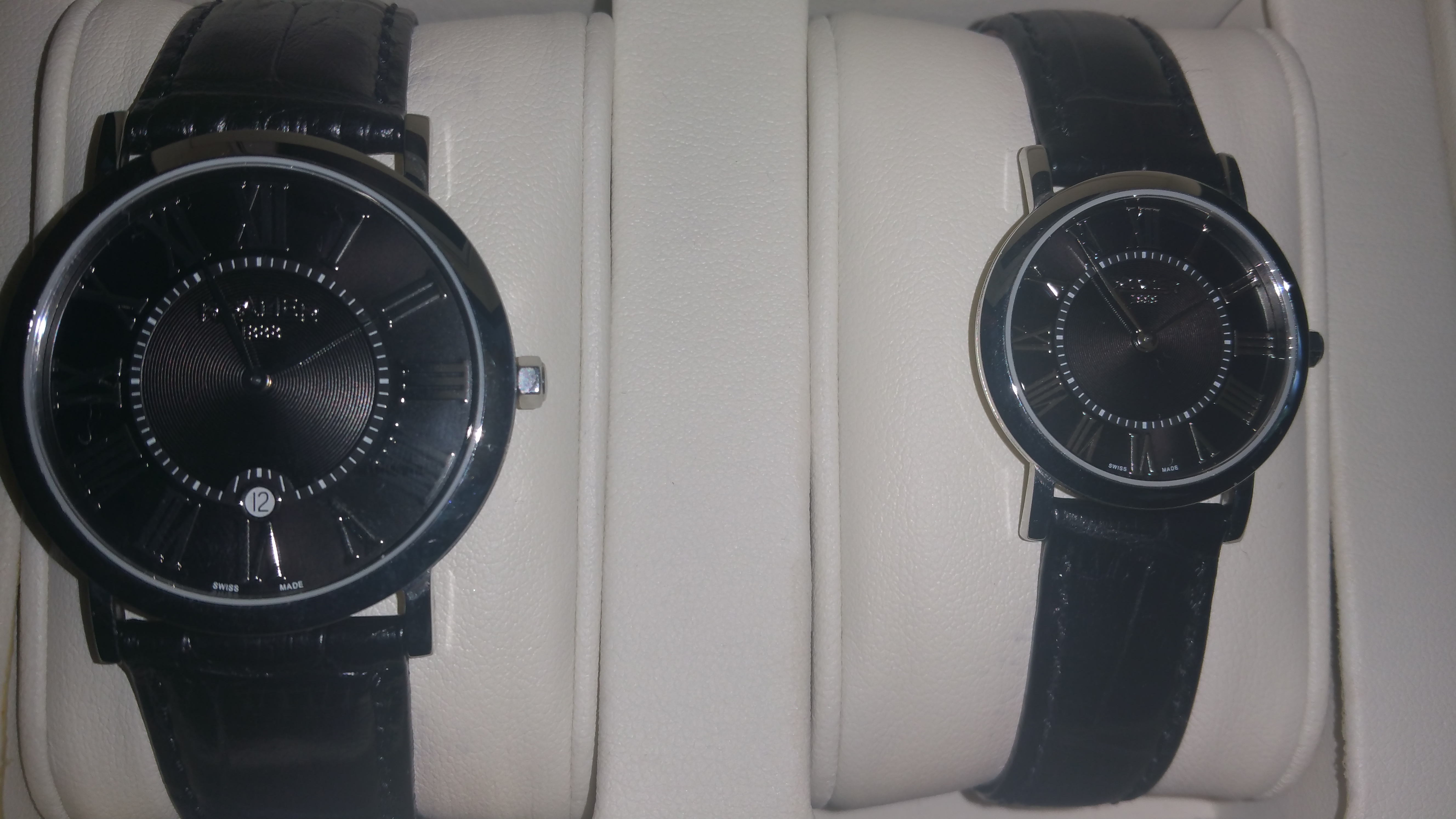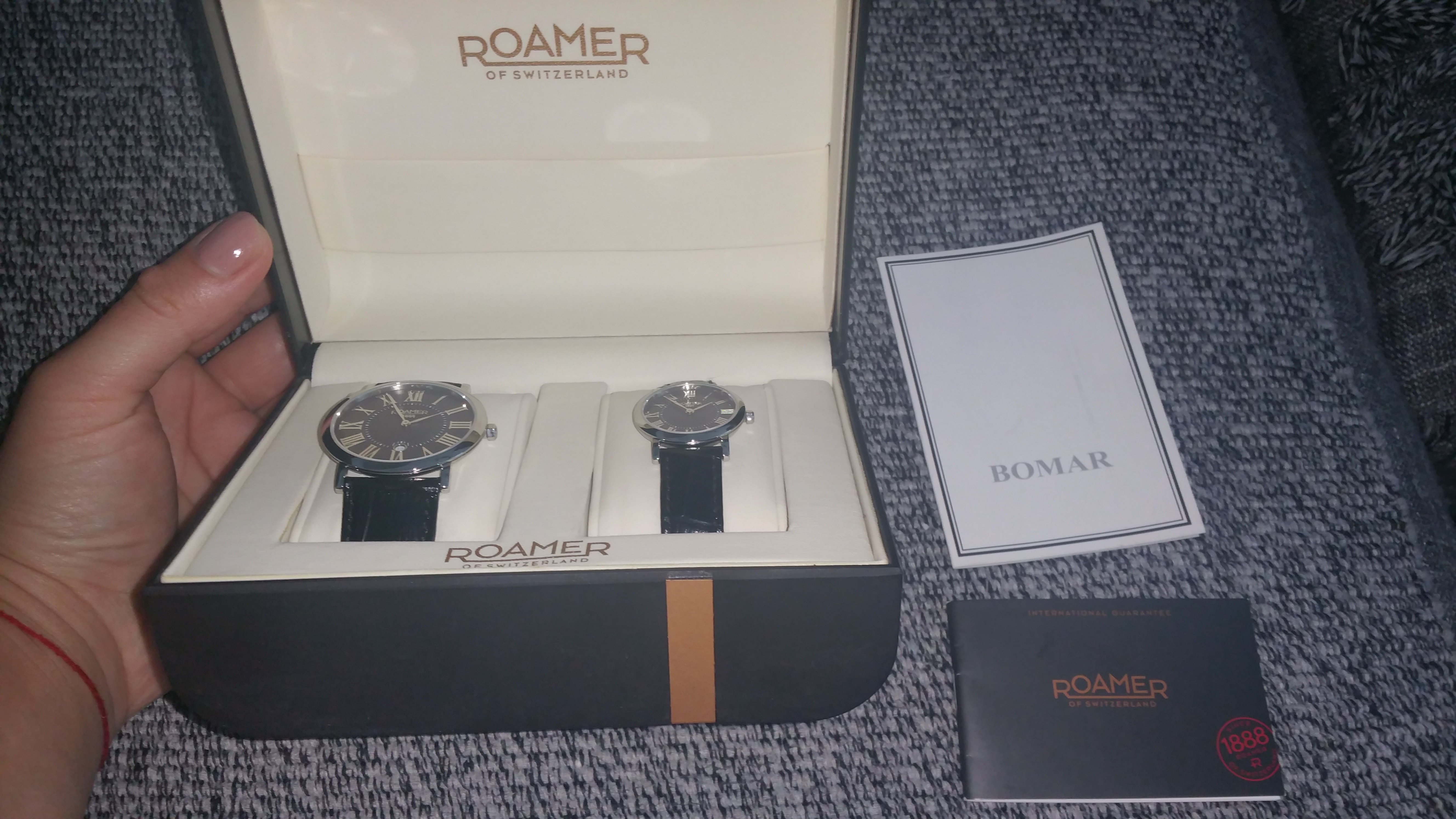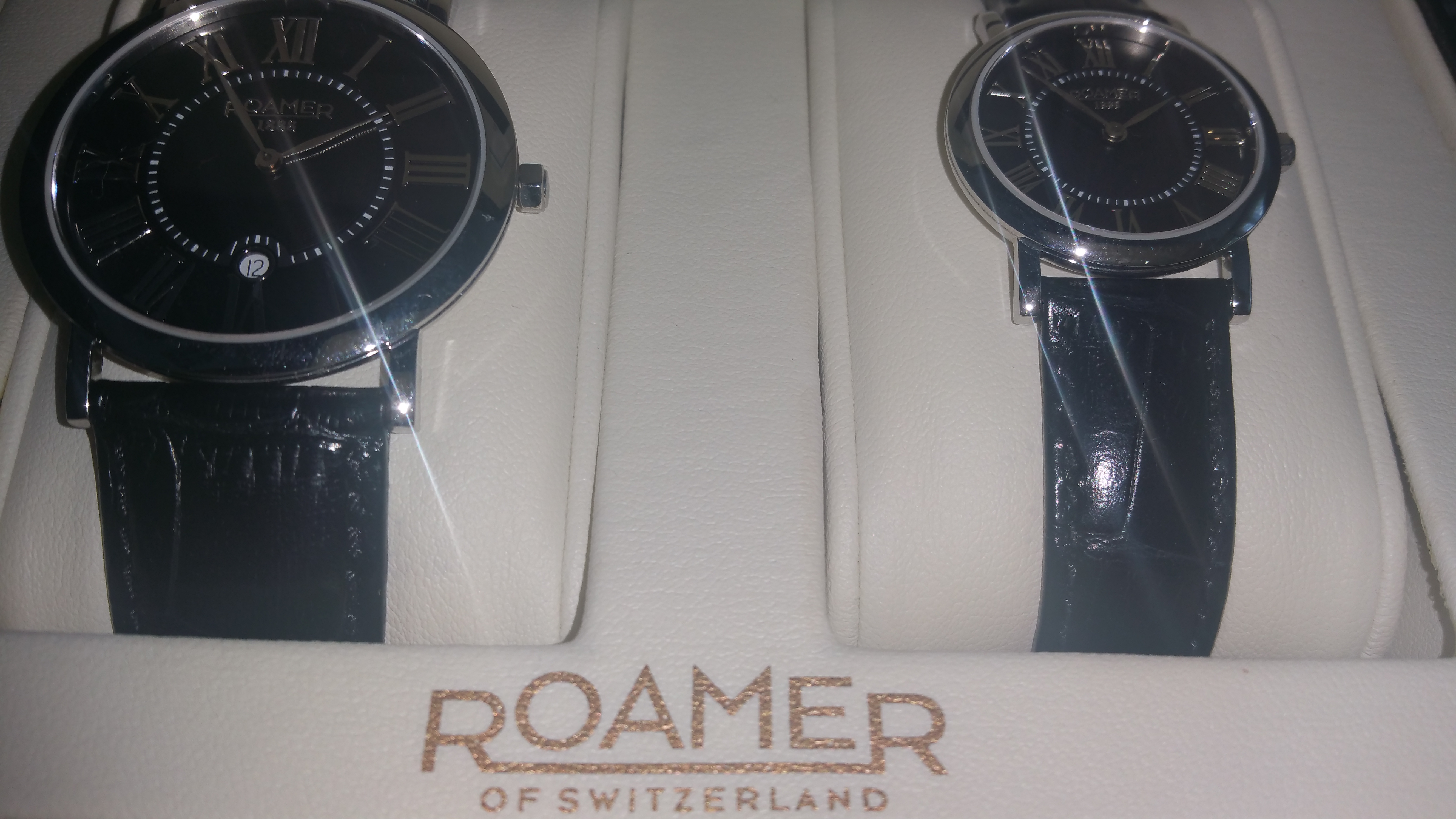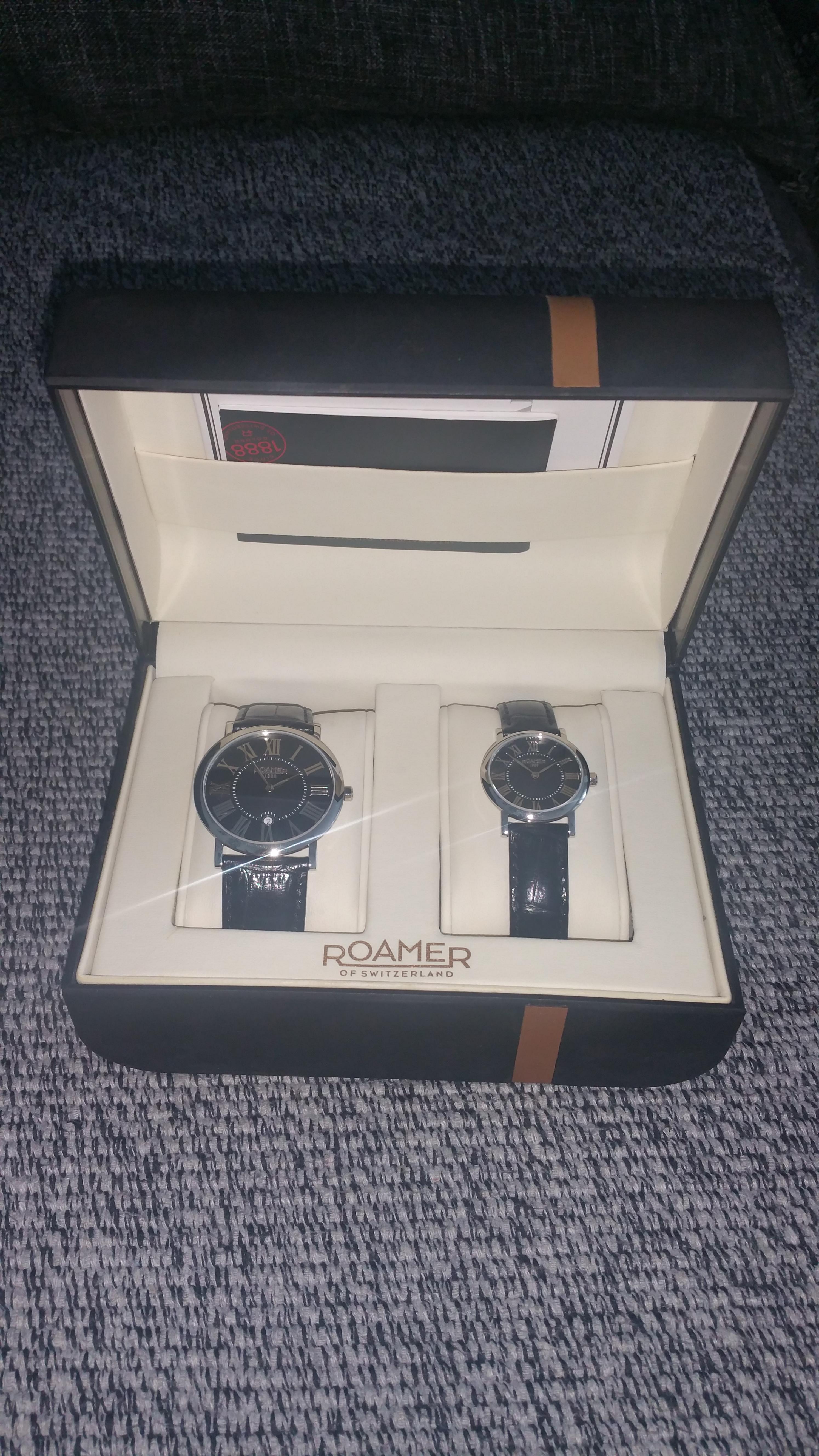 Satovi koji su dobijeni u kompletu na poklon. Nikada noseni od kada su kupljeni. Muski i zenski. Samo su stojali u kutiji i to je to.Prelepi su. Kozne crne narukvice. Svako ko se razume zna sta znaci marka Roamer. Cenu i sami videti u Bomaru gde je i kupljen. Cena u kompletu je konstantno ista 37.990 dinara.