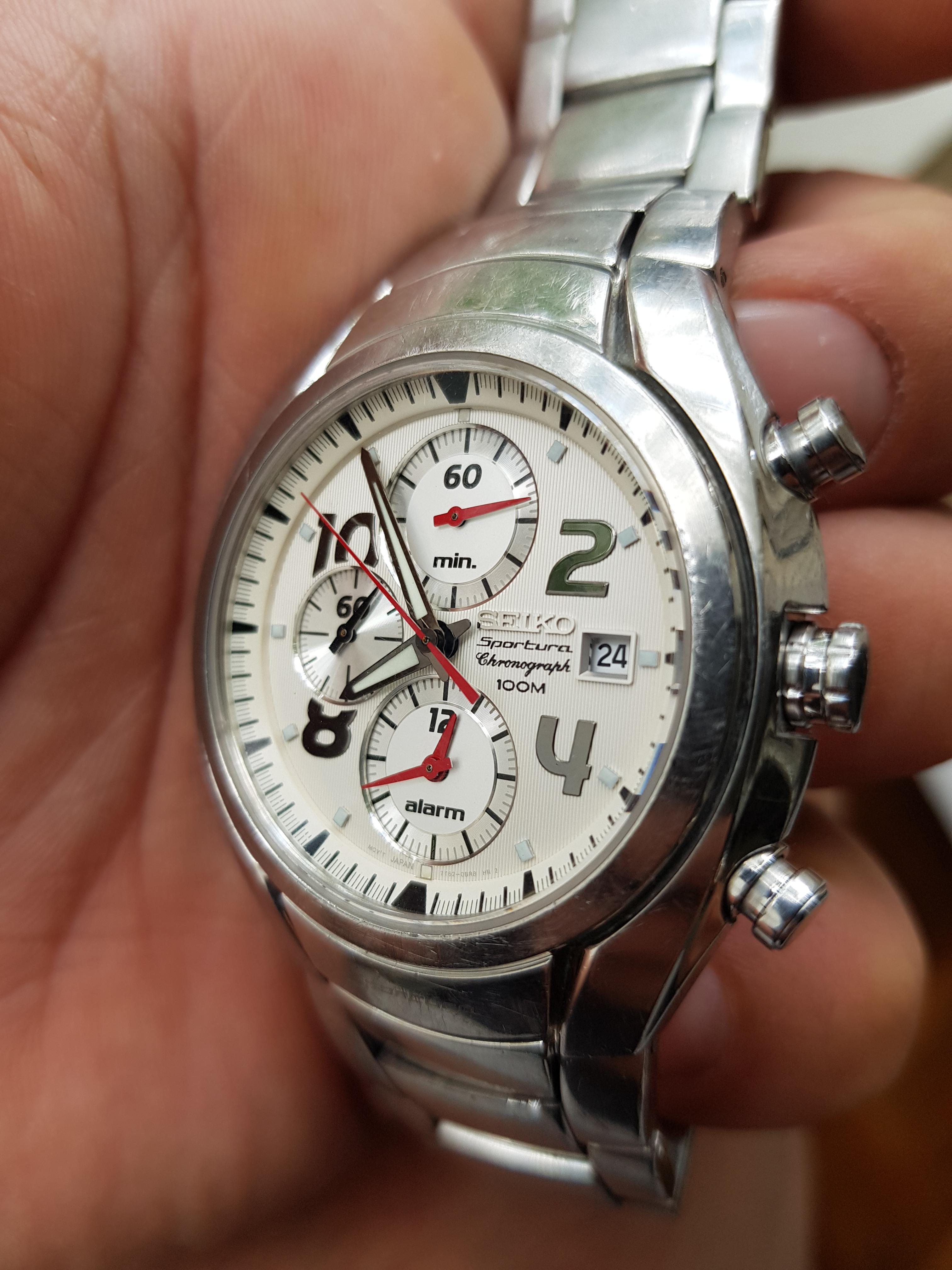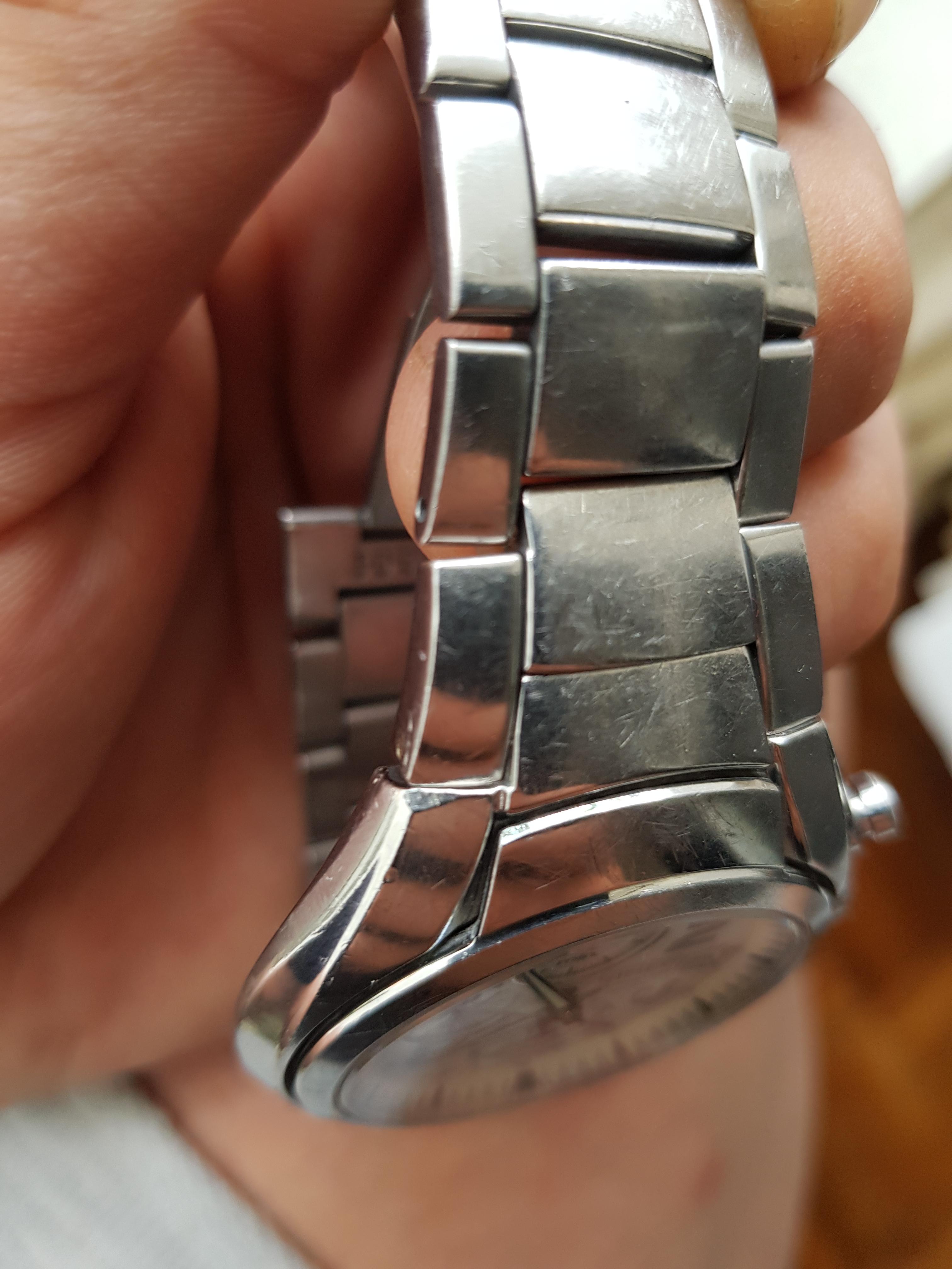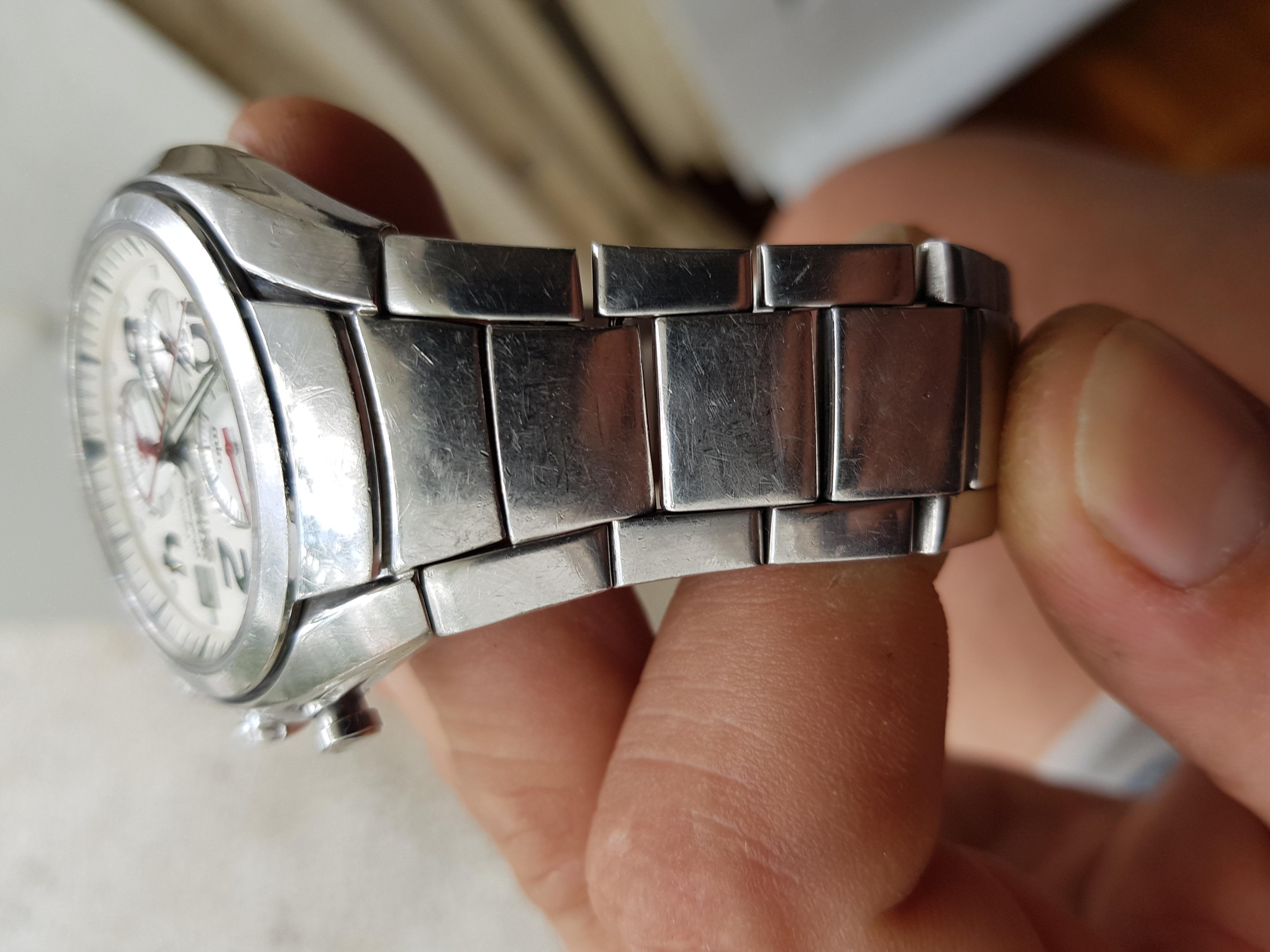 Korišćen sat, safirno staklo bez ikakvih oštećenja, potpuno ispravan, i u funkciji, na narukvici i kućištu vidljivi risevi, narukvica nije u full dužini.