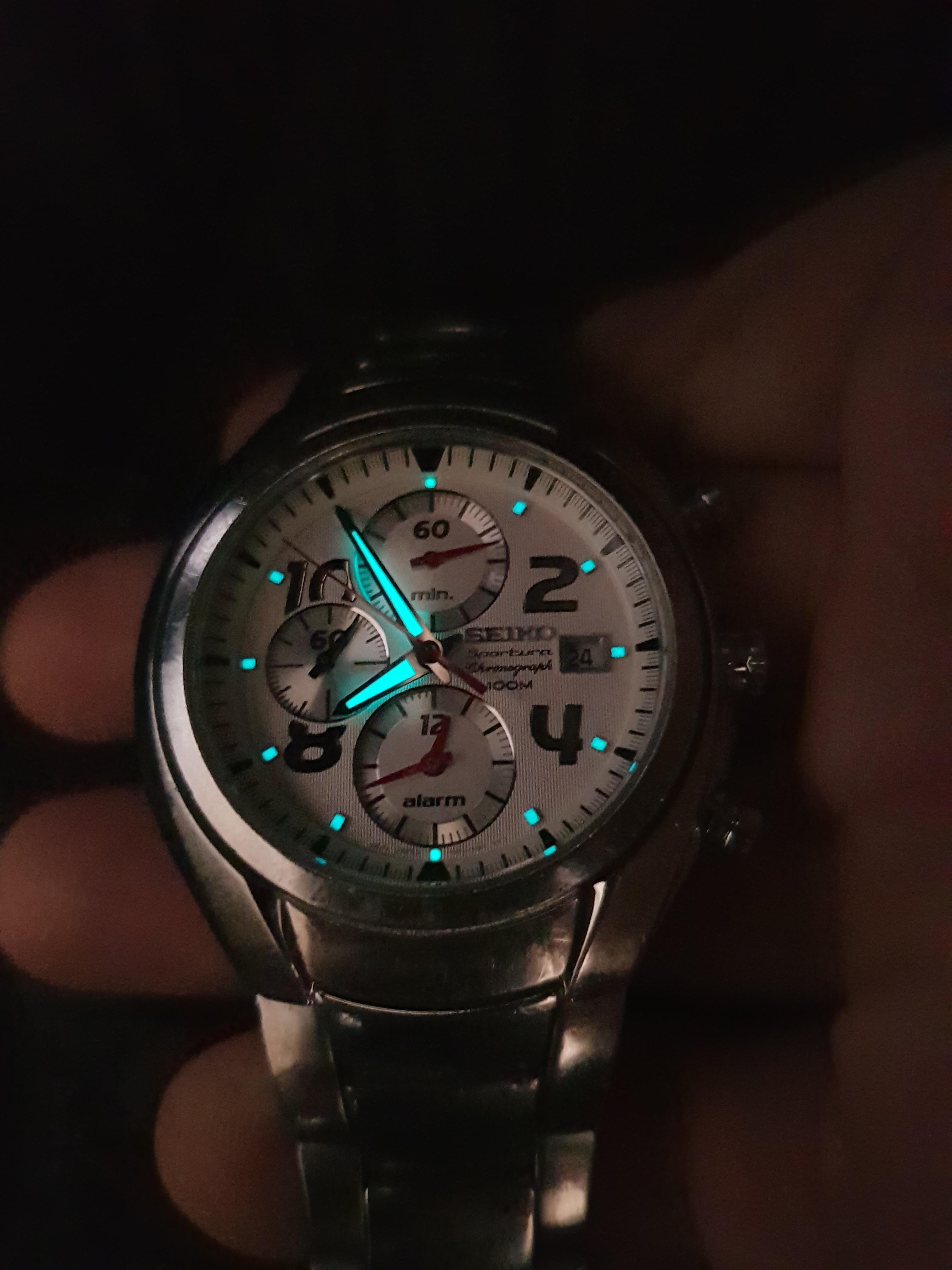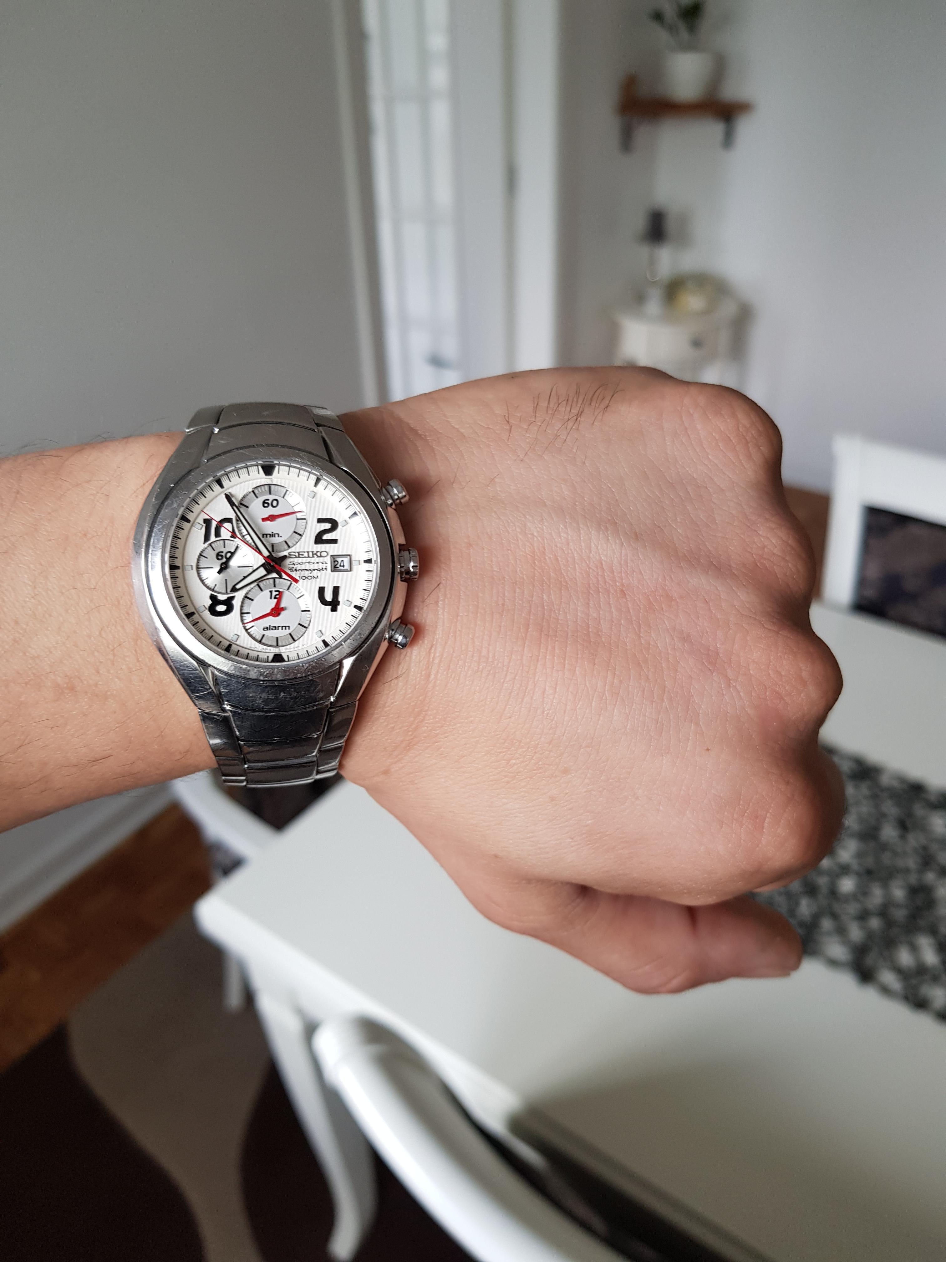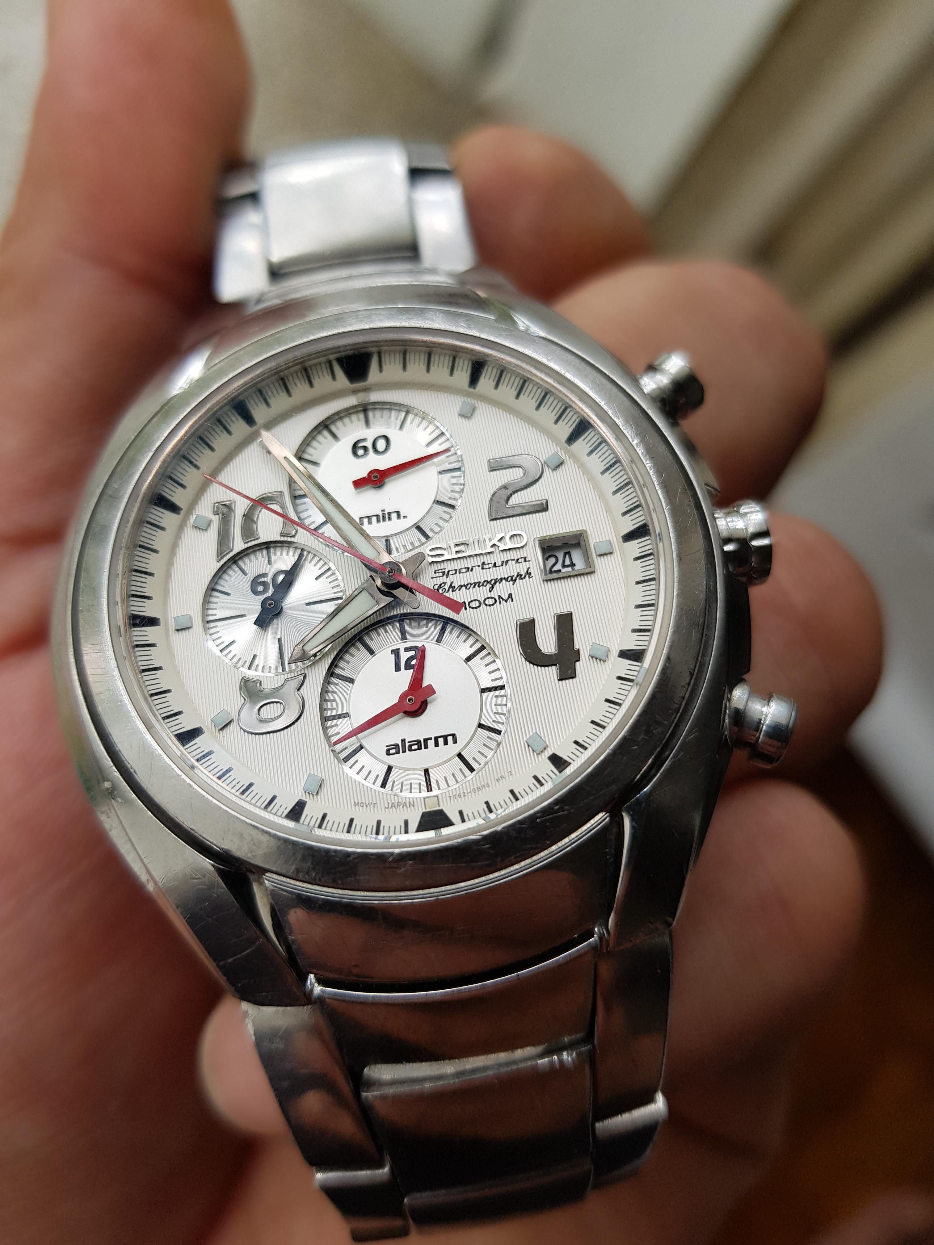Korišćen sat, safirno staklo bez ikakvih oštećenja, potpuno ispravan, i u funkciji, na narukvici i kućištu vidljivi risevi, narukvica nije u full dužini.