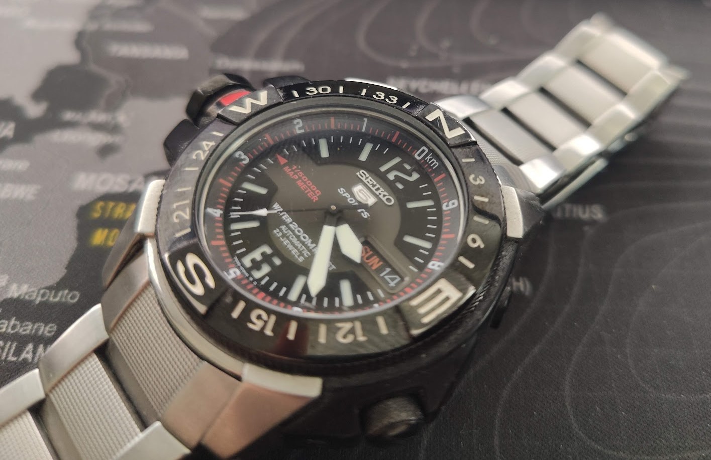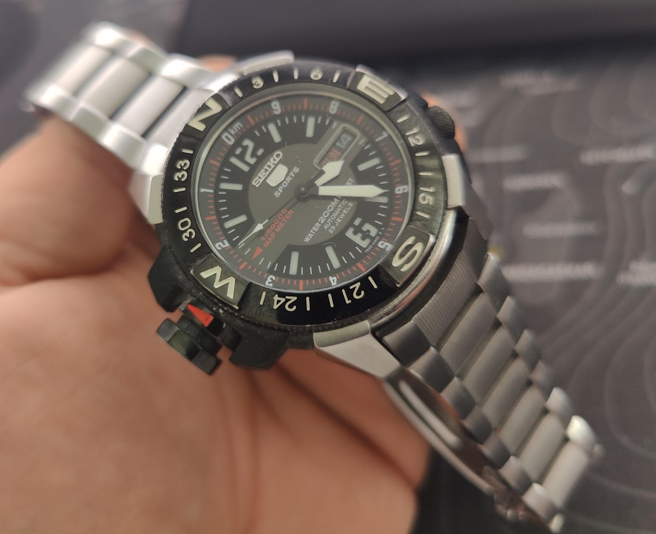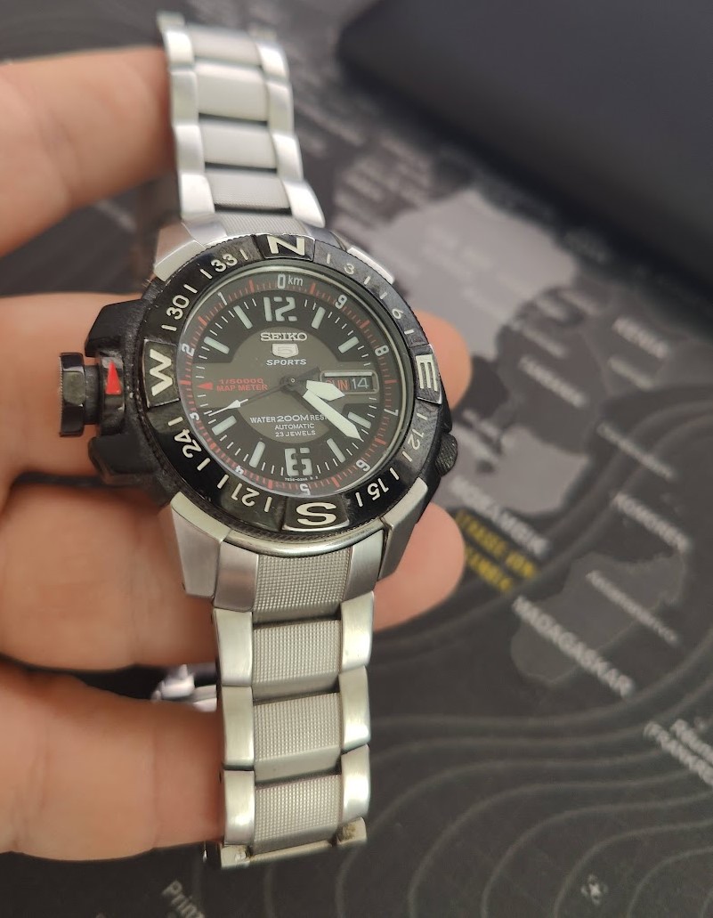 Sat dobro ocuvan. sve full ispravno, automatik sa metalnom narukvicom. redak i kvalitetan Seiko primerak. jako redak na nasim prostorima. Seiko 5 Automatic Map Meter 200 M https: //www. chrono24. com/seiko/seiko-5-skz223-automatic-map-meter-200-m-7s36-02k0----serviced---ss-bracelet--rubber-strap--id22653134. htm#gref https: //www. anibis. ch/fr/d-bijouterie-~-horlogerie-montres-bracelets-autres--3167/seiko-5-sports-7s36-02k0-gebraucht--27980564. aspx