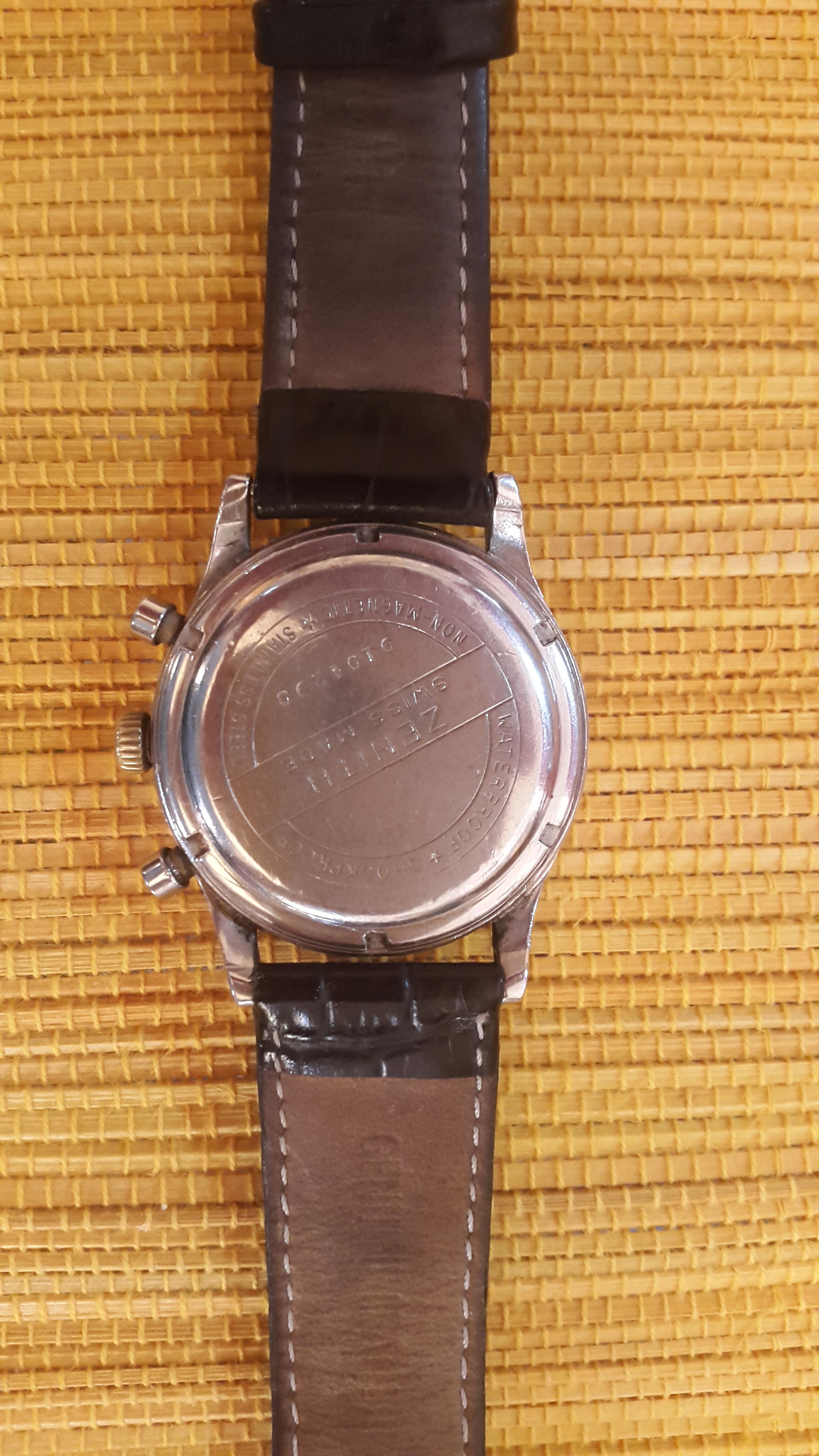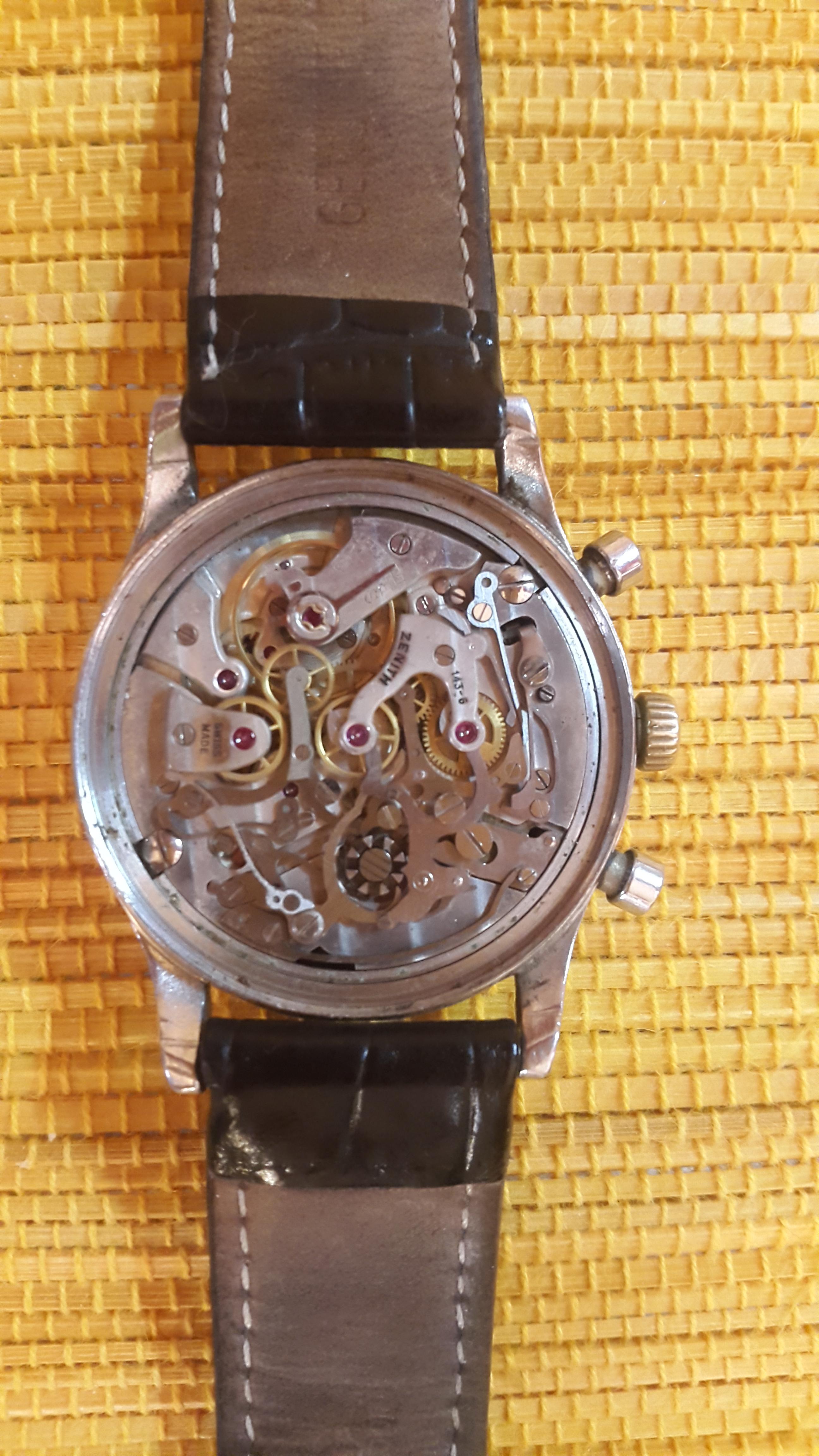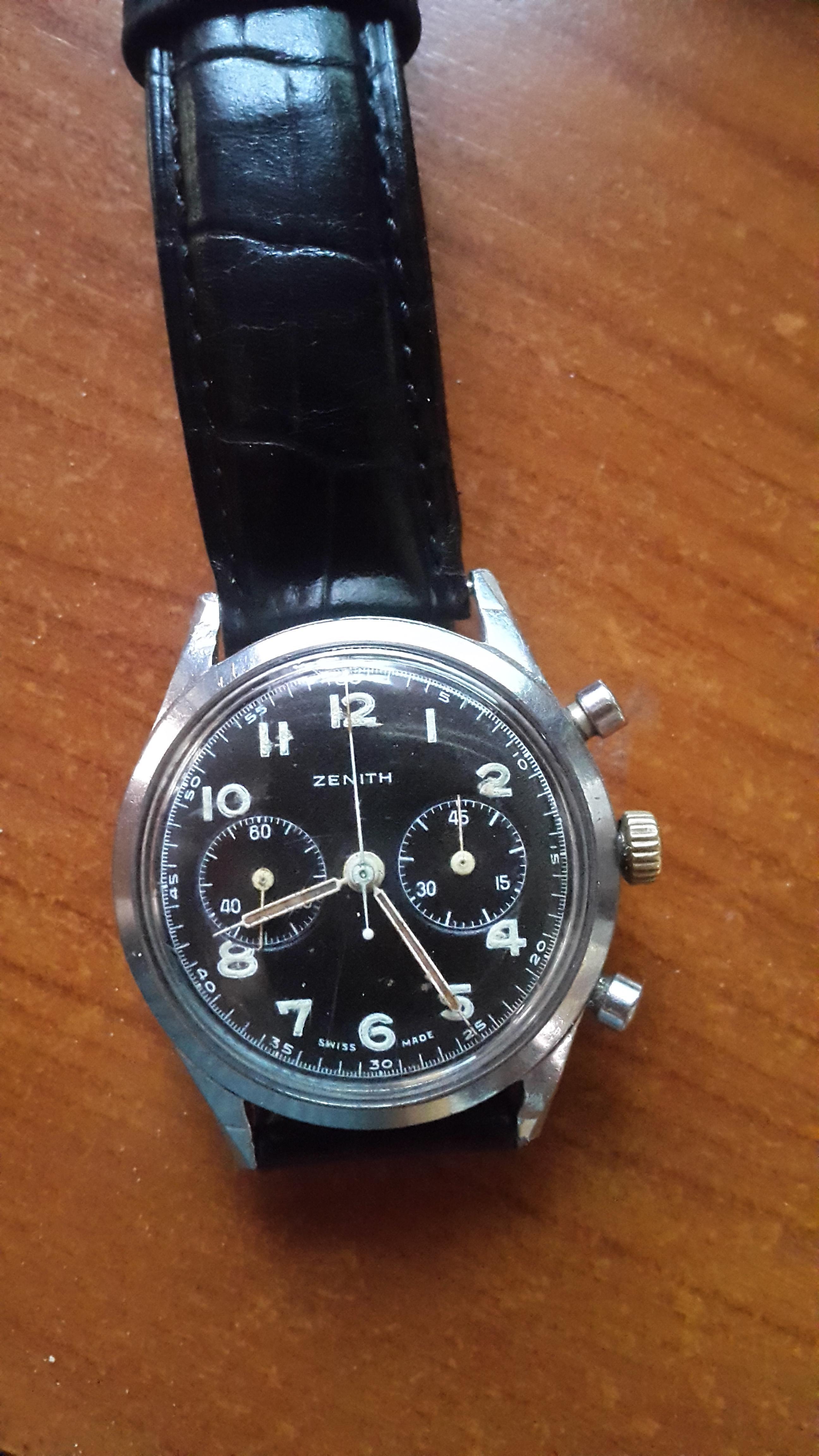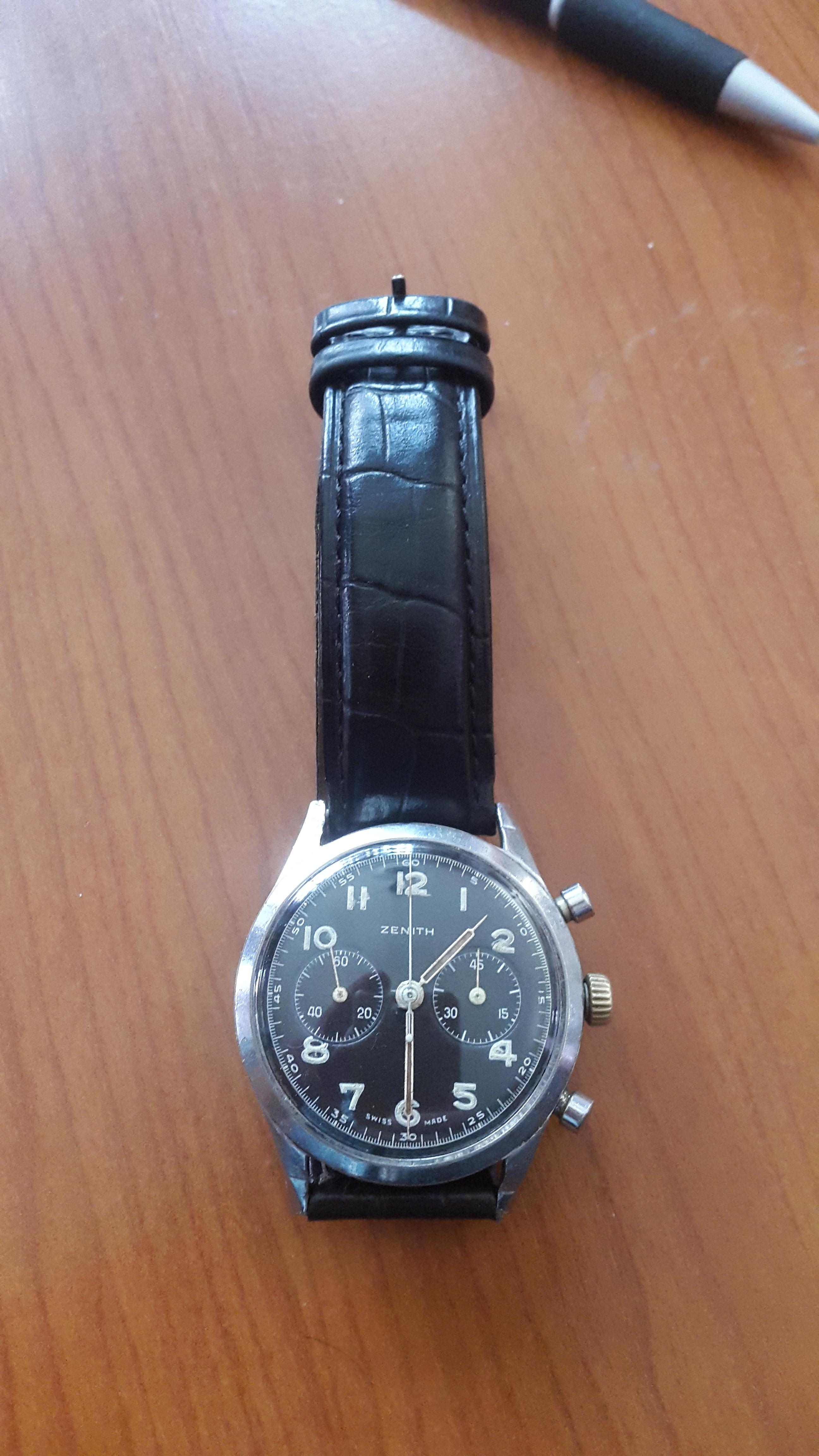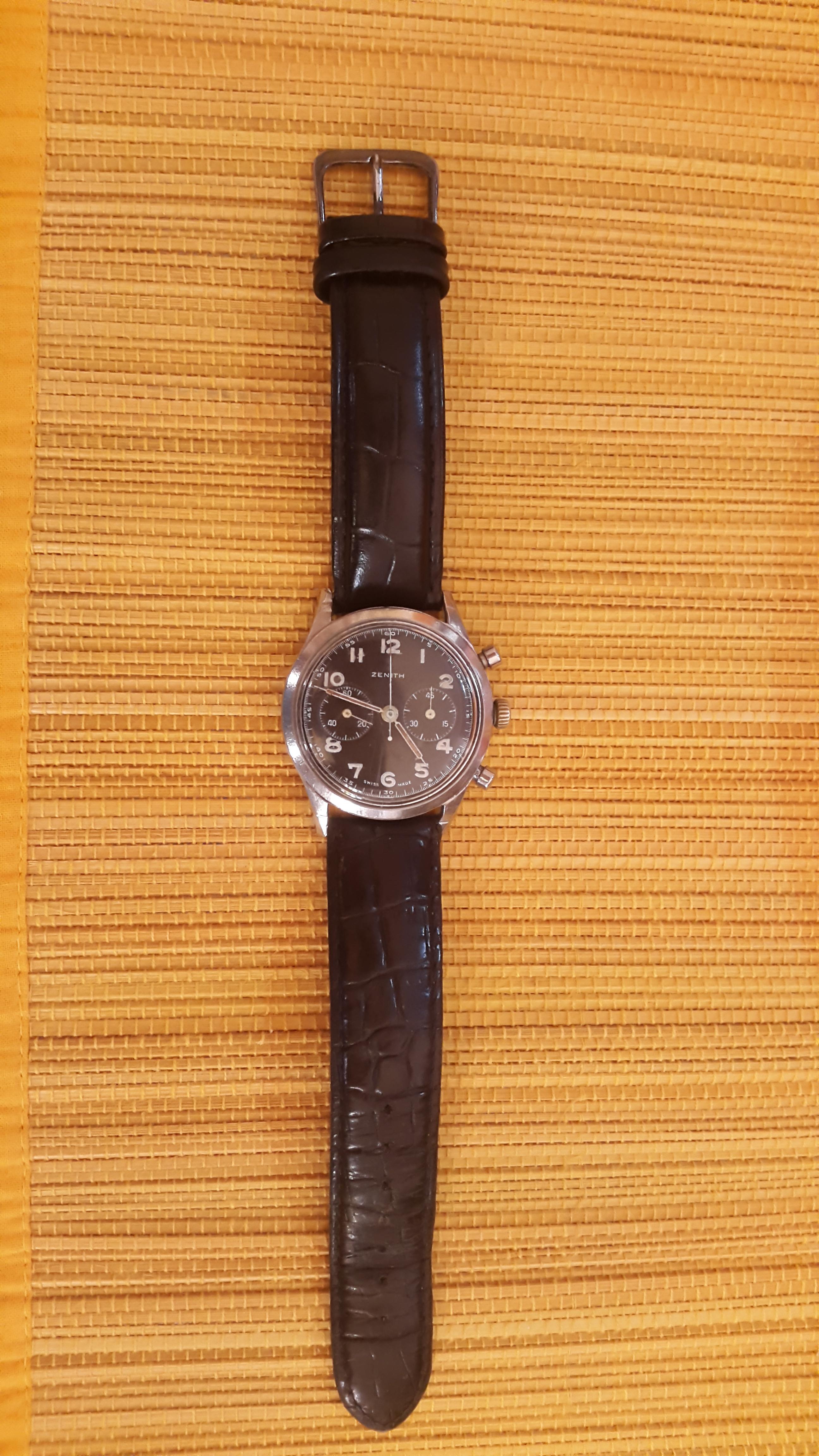 Prilično star sat iz 1945, kolekcionarski primerak. Vrlo redak. Samo ozbiljni kupci. Sve u svemu u dobrom stanju. Nisam ga nosio sigurno vise od 20 godina. Stoperica radi perfektno, kao i sat. http: //www. chrono24. com/en/zenith/chronograph--kaliber-143-6--id3031558. htm