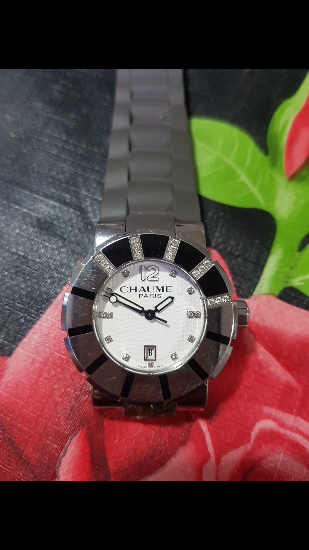 Gumena brizletna je iskidana. Sto se tice sata. Sat je izuzetnog kvaliteta sa dijamantima. Ima ga na internetu koliko je njemu prava cena. Za vise inf na tel 0616402926.sms.viber.poziv