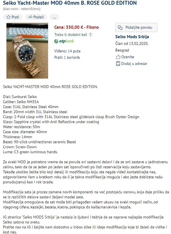 Meni je jos uvek nepobediv oglas na KP gde se za Seiko 5 sa 7s36 pod nadimkom „Nautilus“ trazi 1000€ uz napomenu da je toliko vredan i tezak za nabaviti. Ne budem lenj, odem na Chrono24, a tamo izlog pun, a cena 5x manja ?????? Nije da me je bacio u sumnju uopste, vec sam samo hteo da vidim dozu neinformisanosti, pardon, bezobrazluka.
